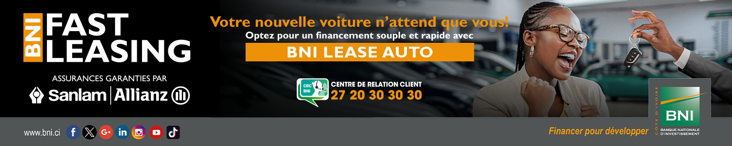 BNI LEASE AUTO PARTICULIERS est une formule de financement sous forme de crédit-bail permettant à un particulier d'acquérir un véhicule neuf, auprès d'une liste de concessionnaires agréés. À travers cette formule, le client demandeur pourra acquérir pour son usage personnel un véhicule, immatriculé moyennant le paiement d'un loyer périodique (mensuel, trimestriel...).